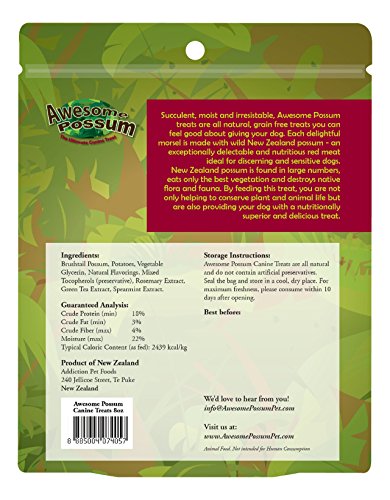 New Zealand possum is found in large numbers, eats only the best vegetation and destroys native flora and fauna. By feeding this treat, you are not only helping to conserve plant and animal life but are also providing your dog with a nutritionally superior and delicious treat.