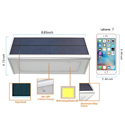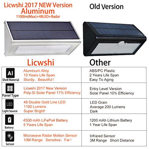 - 【Ultra Bright LED Solar Lights】Licwshi SL01 have 48 bright LED lights. That means each light can light up 60 square meters. Bright enough to offer excellent illumination and turn the dark space into a bright lighted space. Great detector for security. No worry about being outdoors in the dark at night.