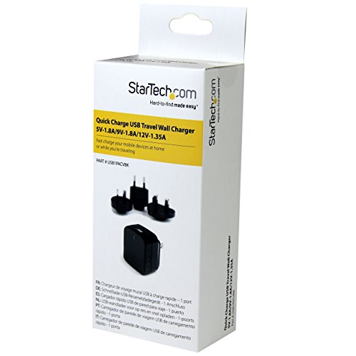 Fast charge your mobile devices at home or while you're traveling - Are you planning an international business trip? Do you need a wall charger that will charge your devices in time for all of your meetings and presentations? Now you can charge your mobile devices in less time, and ensure you're always prepared even while you're away, without having to worry about whether or not the adapter you use at home will work overseas. This versatile travel charger ships with interchangeable power plugs that let you plug in and charge your devices nearly anywhere you go around the world. Plus, when connected to devices that support Quick Charge 2.0, it delivers more power than conventional chargers in order to make sure you are up and running faster. International travel - universal power adapter The wall charger includes a universal power adapter, which lets you plug in to any electrical socket almost anywhere in the world. So, no matter where you're travelling to, you can rest assured that you'll be able to keep your mobile devices charged and ready to use. Fast charging - Qualcomm Quick Charge 2.0 certified Be ready when you need to be with 75% faster charging than regular wall chargers when used with compatible devices. The charger also works with regular devices that do not support Quick Charge 2.0, and will charge with your other devices at regular speeds. Compact and lightweight - portable design The portable USB wall charger features a folding North American plug that tucks away nicely to fit inside your laptop bag, purse, backpack or other carrying case, making it the perfect mobile accessory for any carry-on. The USB1PACVBK is backed by StarTech.com's 2-year Warranty to ensure dependable performance. Note: Some mobile devices such as certain Samsung and BlackBerry devices use proprietary power connections which are not compatible with aftermarket chargers. Please consult the manufacturer's documentation to ensure compatibility with the USB1PACVBK.Feature