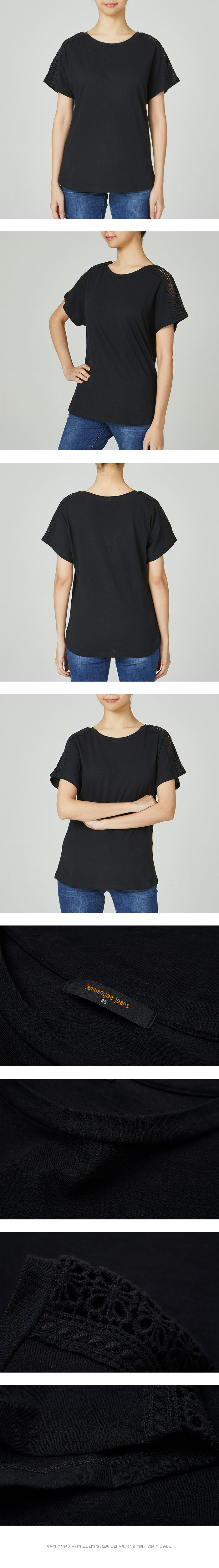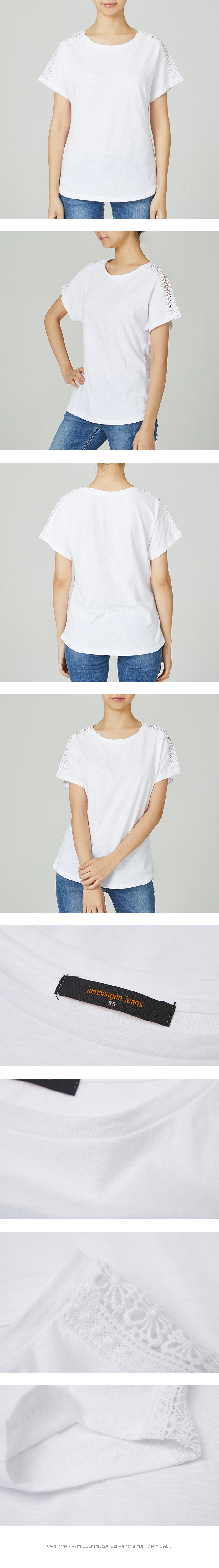 어깨 레이스 장식으로 포인트를 준 여성전용 가오리핏 슬럽 반팔 티셔츠입니다.