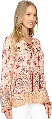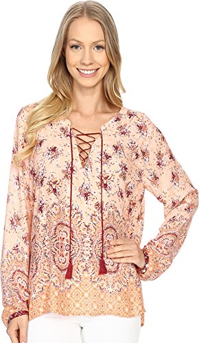 Relaxed fit blouse boasts a colorful print on a lightweight woven fabrication. Split neckline with tasseled lace-up ties. Long sleeves sport button cuffs. High-low hemline. 100% rayon. Hand wash cold and line dry. Imported.