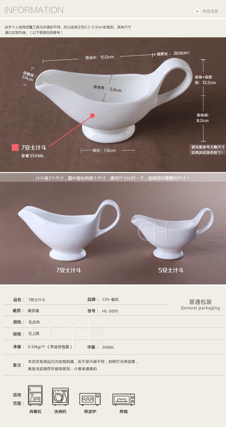 瓷航7安士汁斗纯白色酱料壶陶瓷奶盅黑椒酱壶西式餐具西餐350ml