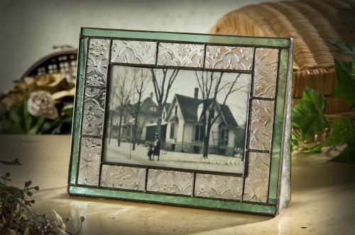 -. Feature : Clear glass with an embossed vintage texture and sage green trim / Picture Frame Holds a 4x6 Horizontal Landscape Image / Triangular glass sides and base support the frame adding stability and style unique to J Devlin / Handcrafted stained glass photo frame made with lead free solder to protect you and the environment / Designed and Manufactured by J Devlin Glass Art 8 3/4 x 6 1/2 x 2