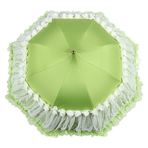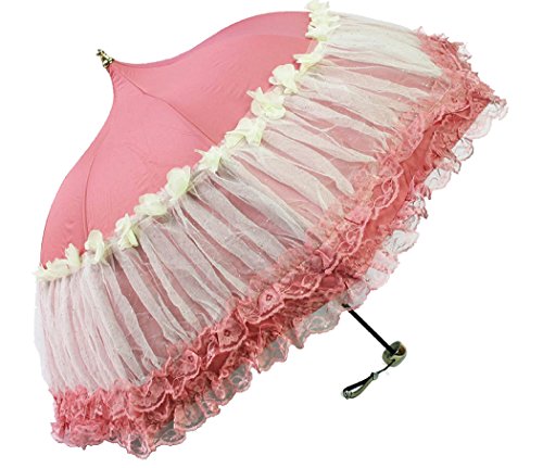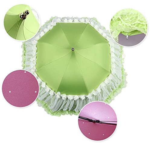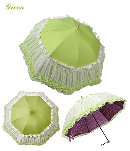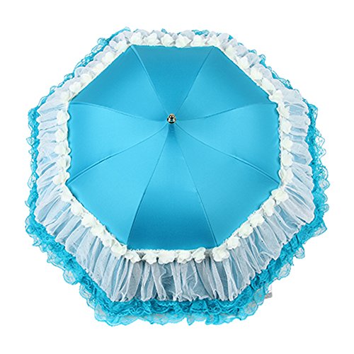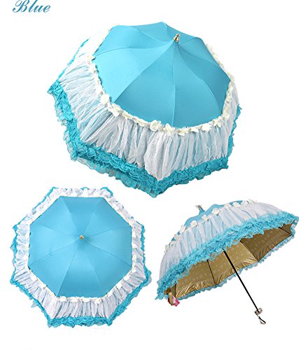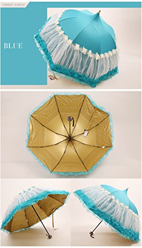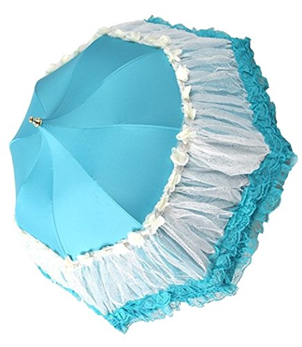 -. Brand : Honeystore -. ClothingSize : Medium -. Department : womens -. Feature : SPF: UPF 50+; Diameter: 34.6inches / 8 ribs made from strong fiber for extra support. / Made by 100% high-density water repellent polyester fiber and sunscreen fabric. / Can be used in rain and sunny day. / Honeystore is a registered brand and has its own Honeystore Tag and the Honeystore trademark. Make sure the seller is Honeystore to avoid buying fake items. -. Model : HSY1607C3 -. ProductGroup : Apparel -. ProductTypeName : LAGE -. Size : Medium -. Title : Honeystore Pagoda Parasol 3 Folding Lace Totes Sun Rain Wedding Ruffle Umbrella