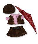 -. Feature : Teddy bear Cowboy outfit / includes hat, bandana, skirt and top with vest / fits 15 inch plush / pink plaid top / classic red bandana