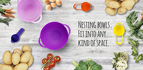 8 pc Color Compact Food Prep Nesting Mixing Bowl Set Plastic - with Non Slip Bowls, Colander, Sieve and Measuring Cups Stackable Kitchen Dishwasher Safe Salad, Cake and Bakery, Vegetable, Fruit
