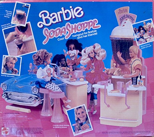 -. Feature : Barbie Soda Shoppe w 75+ Pieces is a 1988 Mattel Hawthorne production, made in Mexico. *See PRODUCT DESCRIPTION. / INCLUDES: 'Working' Soda Fountain, 2 Serving Counters, 2 Child size Soda Glasses/Stools, 2 Stool Seats, Parking Curb, Pretend Blender, Spatula, Tongs, Catsup Bottle (Ketchup), Mustard Bottle, Pitcher, Napkin Holder, Cash Register, Juke Box, Salt & Pepper Shakers, 4 Sundae Dishes, 4 Hot Dog Trays, 4 Mugs, 4 Plates, 4 Spoons, 4 Knives, 4 Forks, 4 Double Scoops of Ice Cream, 2 Serving Trays, 4 Hamburger Patties, 4 Hamburger Buns, 4 Hot Dogs, 4 Hot Dog Buns, 4 French Fries, 4 Pizza Slices, Labels. / Counter Stools doubles as Children's Drinking Glasses! Fill Fountain Favorite Drink, then Pull Fountain Lever & Pour! / REQUIRES ADULT ASSEMBLY. For Ages 3+ Years. All colors, sizes & details are provided to the best of my ability & may not be exact & may vary. / *NEW & SEALED. Box has issues. *IF you need more Pictures or Info - Contact Seller. For Box Condition see CONDITION NOTE or Email Seller for Details.