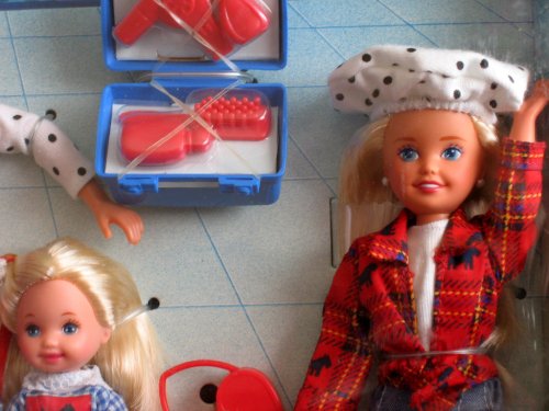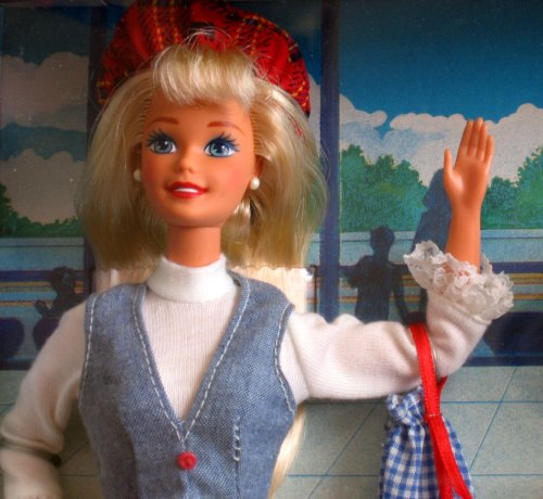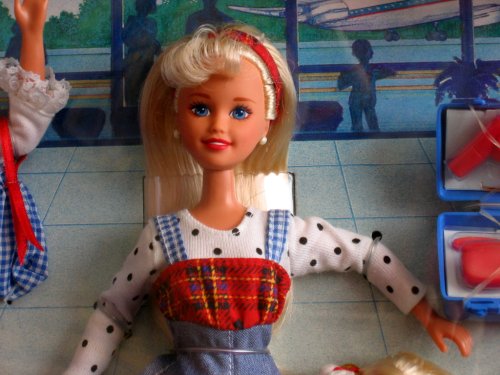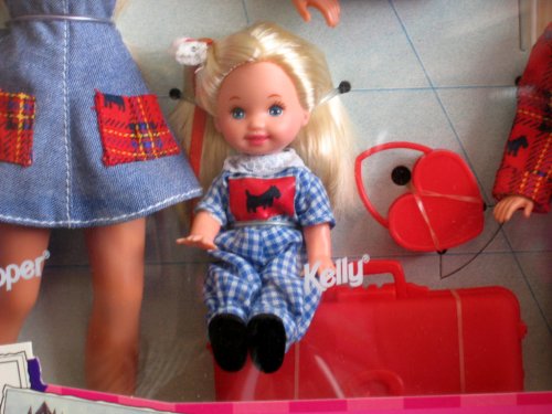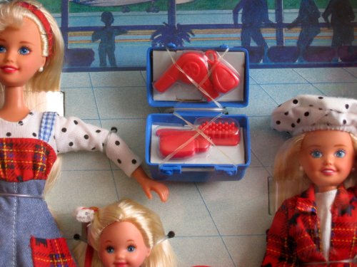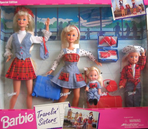 Barbie & Travelin' Sisters Playset is a 1995 Mattel production. Model #14073. Included in this Playset are 4 Dolls; Barbie, Skipper, Stacie & Kelly. Barbie doll is approx. 11.5" tall, Skipper doll is approx. 9.5" tall, Stacie doll is approx. 7.5" tall & Kelly doll is approx. 4.5" tall. BARBIE DOLL has long blond hair & blue eyes; she wears a one piece Body Suit that has white long sleeve Top w/white lace sleeve ends & a red tartan plaid pleated Skirt & blue denim Vest w/small red buttons on front. She also has a blue & white checked fabric purse w/red handle, white button finger ring & earrings and a red tartan plaid Beret; Barbie comes with Shoes. SKIPPER DOLL has long blond hair & blue eyes & she has a red tartan plaid head band in her hair & white button earrings. Skipper wears a one piece Body Suit that has a long sleeve white with black dots Top & a Jumper that has red tartan plaid top & pockets with a blue denim Skirt; shoulder straps are blue & white check fabric. Skipper also comes w/shoes. KELLY DOLL has long blond hair & blue eyes & she wears a white & blue one piece outfit (pants bottom) that has a red w/black dog decal on front. She wears black Shoes & in her hair there's a white w/black dot bow. STACIE DOLL has long blond hair & blue eyes & she wears a white w/black dots Beret & white button earrings. She also wears a red tartan plaid long sleeve Jacket w/ties at waist, a white Top & blue denim Pants; she come with Shoes. Also included in this Playset are 2 Suitcases - red & blue, and there's a blue Case with red Hair Dryer, Perfume Bottle, Brush and Lotion Bottle. There's also a red heart shape plastic Purse & a Hairbrush. All the provided information is to the best of my ability & may not be exact; colors, styles, sizes & info may vary. Barbie & Travelin' Sisters Playset, a 1995 Mattel production is great for any collection, as a gift or just for fun play!Feature