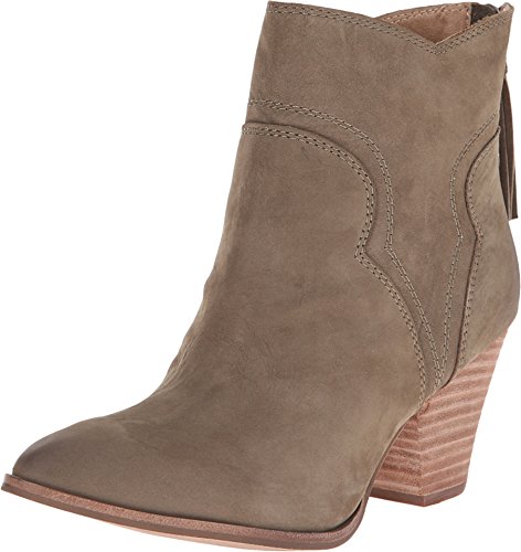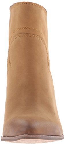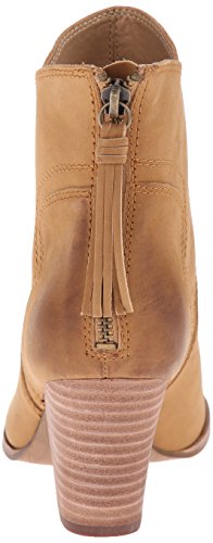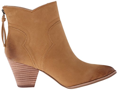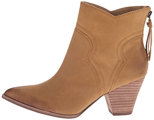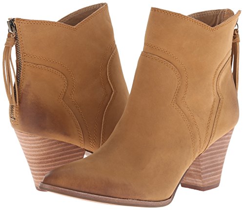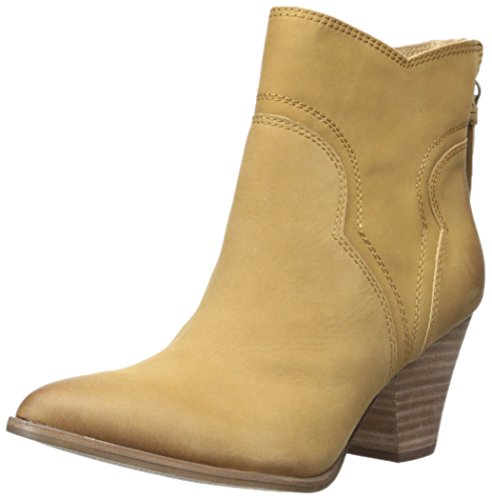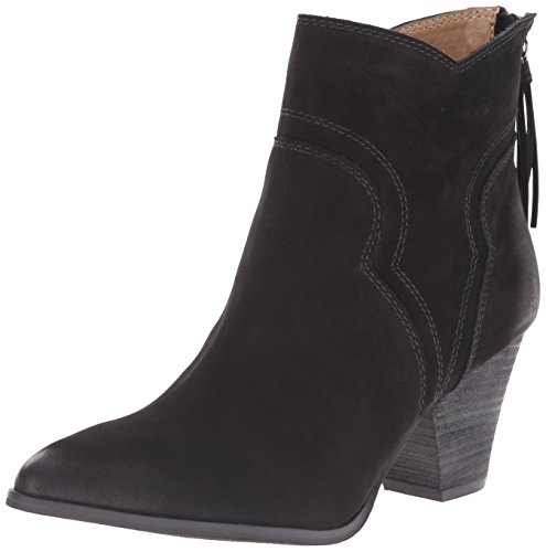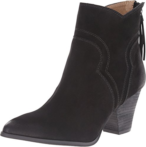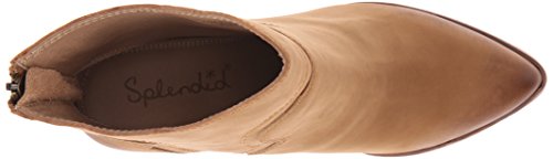 Western-style Splendid booties in sturdy leather. Rubbed edges lend a worn finish. Notched shaft. Exposed back zip. Stacked heel and synthetic sole.