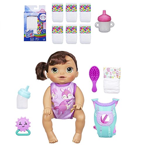 -. Title : Baby Alive Baby Go Bye-Bye Bundle: Brunette Doll with Baby Alive 6-Pack Diapers and Sippy Cup Refill