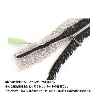 簡単に編み付けることができる両サイドに穴の開いたファスナーを使用したキットです。使いやすいおしゃれなポーチが作れます。中級者の方向けです。 |