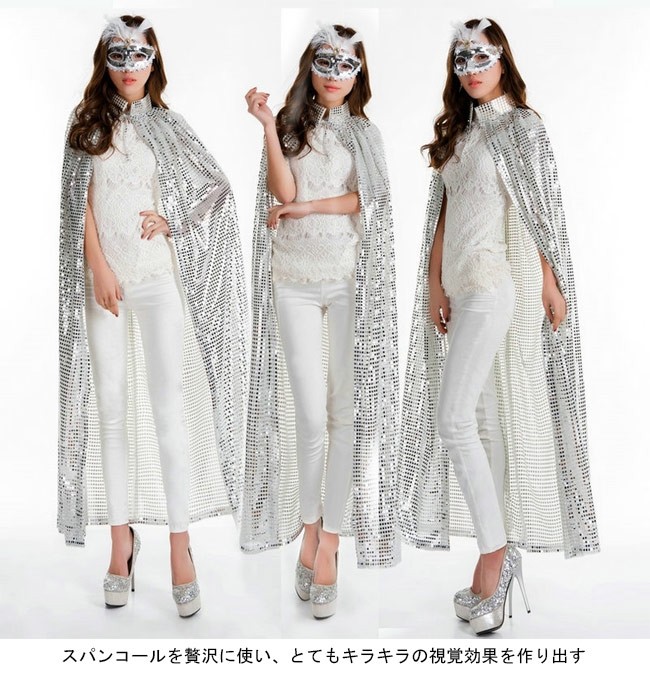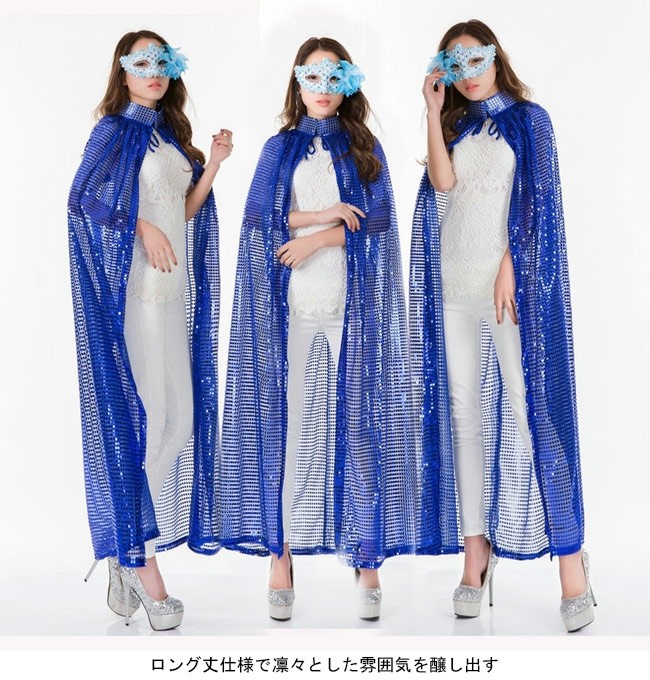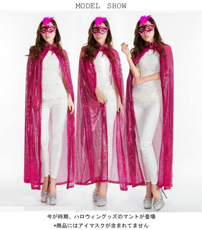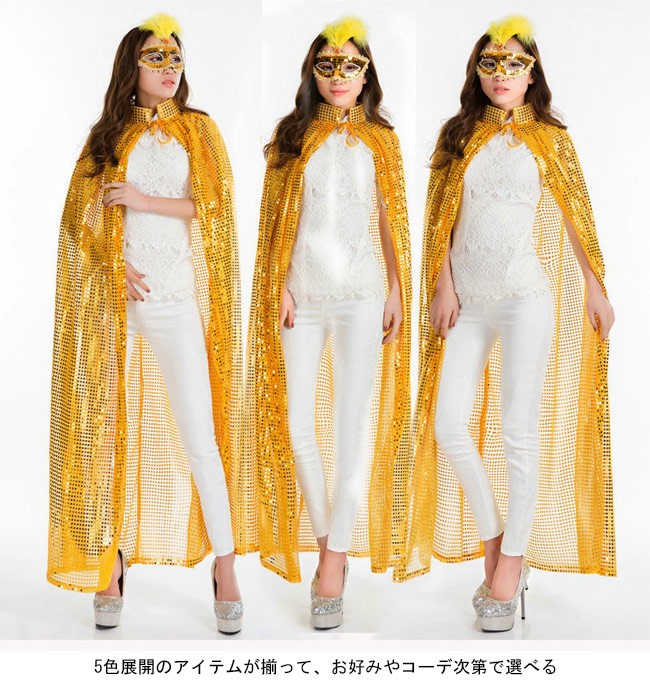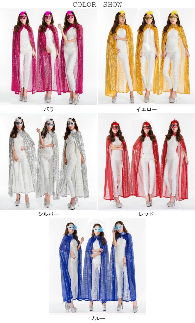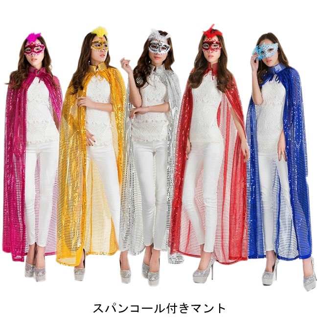 マント スパンコール ロング キラキラ ハロウィン コスプレ ウィッチ 仮装パーティー パフォーマンス 演出 舞台 コスチューム今が時期、ハロウィングッズのマントが登場スパンコールを贅沢に使い、とてもキラキラの視覚効果を作り出すロング丈仕様で凛々とした雰囲気を醸し出す5色展開のアイテムが揃って、お好みやコーデ次第で選べるハロウィンだけではなく、普段のコスプレや仮装パーティー、クリスマスパーティーなどの場合も使える*商品にはアイマスクが含まれてませんカラー:バラ イエロー シルバー レッド ブルー素材 ポリエステルサイズ(cm) FF 総丈140ご注意:※サイズは平置きサイズです。素人採寸ですので、若干の誤差がございます、ご了承ください。