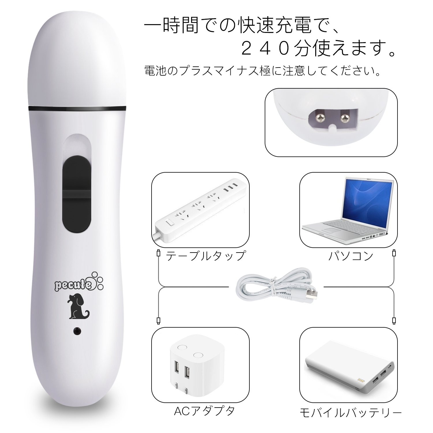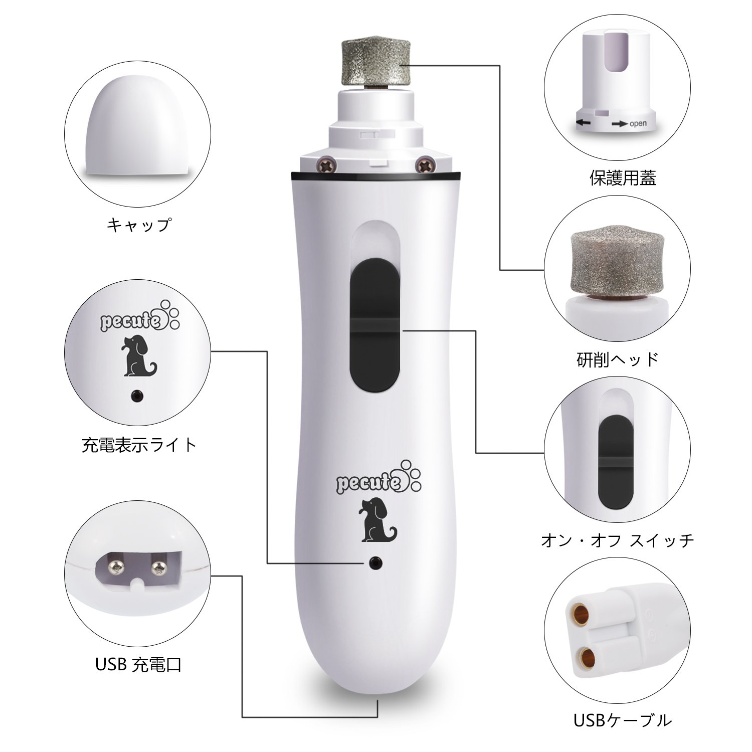 🐾【3つポート】:高速研削、小型ペット、中型/大型ペット等3つのポート付き、ペットによって対応する研削面が違います。ペットのサイズや自分の都合によって自由に対応出来ます。 🐾【USB充電】:USB充電なので、電池入らずに簡単に充電できます。1時間を充電すれば、240分ほどお使いいただけます。DC2.4Vの長寿命のモーターで、よりよい耐久性を持っています。 🐾【静音設計】:モーターが安定してますので、50デシベルを保ち、とても静かです。振動もう小さくて、ペットちゃんが怖がる心配はありません。