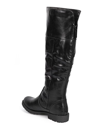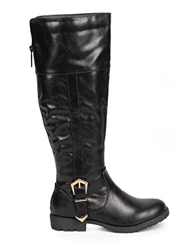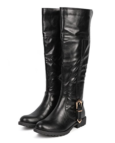 Nature Breeze DA91 Women Leatherette Round Toe Buckle Knee High Riding Boot - Black