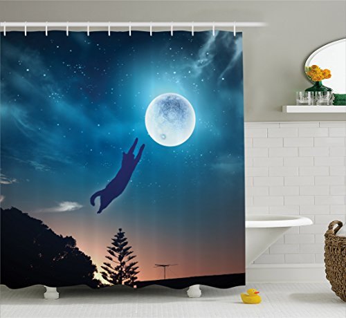 Cat Shower Curtain by Ambesonne, Cat Jumping in the Air Catching the Moon at Night Sky with Stars Fantasy Artwork, Fabric Bathroom Decor Set with Hooks, 70 Inches, Blue Magenta
