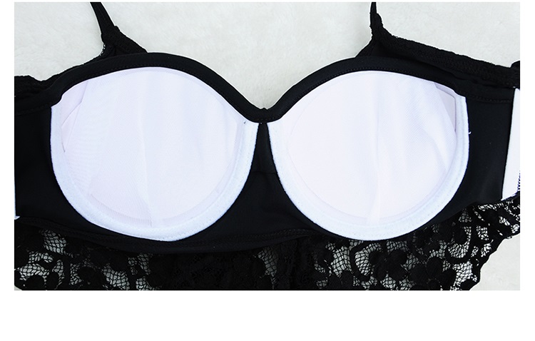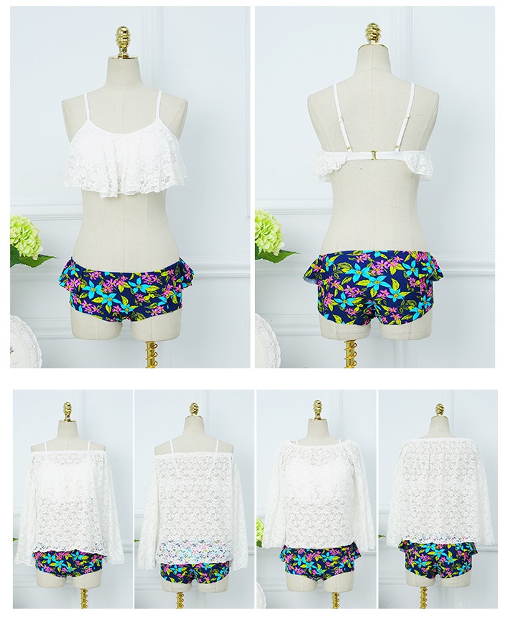 ビキニは、レース&フリルで甘めのトップと、フリルがフェミニンなボトムの組み合わせ。