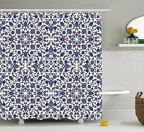 Arabesque Shower Curtain by Ambesonne, Moroccan Floral Pattern with Victorian Rococo Baroque Oriental Design, Fabric Bathroom Decor Set with Hooks, 70 Inches, Cream Indigo Red Blue