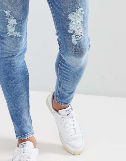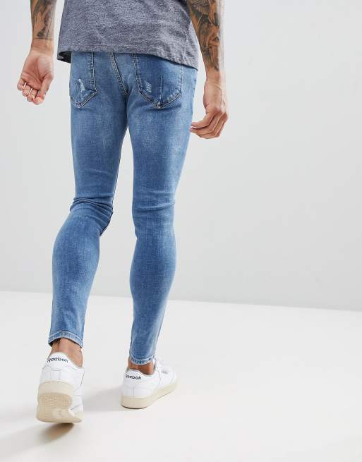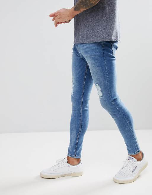 Bershka Super Skinny Jeans With Rips In Mid Blue
