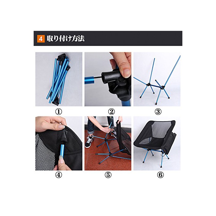 【조립 간단!】수납 가방부터 조립 부품을 내밀기,우선은 프레임 부분을 조립,다음은 수납 가방을 발에 설치합니다,후에 프레임을 좌면원단의 상응 부분으로 끼워넣어 완성입니다.누구라도 할 수 있는 간단한 쌍 아웃도어 체어입니다.