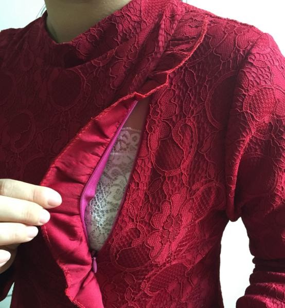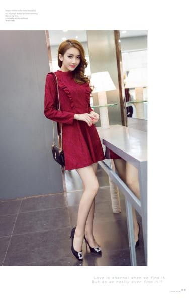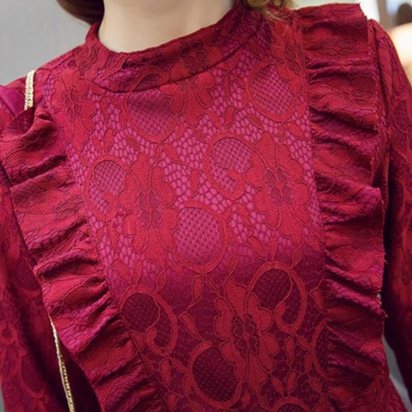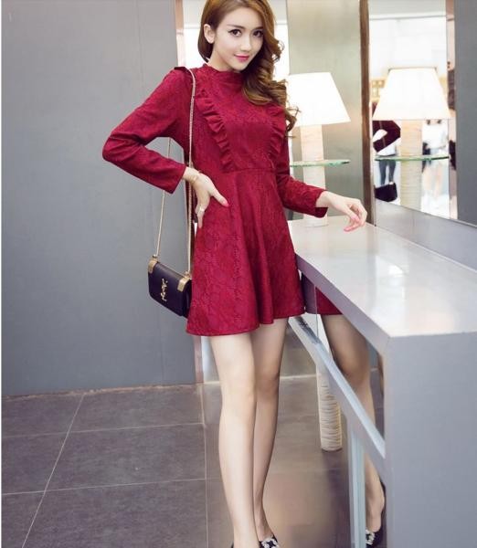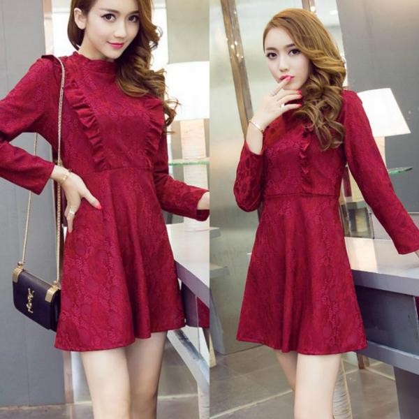 花柄総レース&フリル 長袖 総レース Aラインワンピース レッド/S