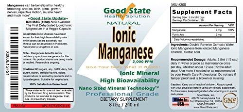 Studio : Good State Publisher : Good State Binding : Health and Beauty Product Description This professional-grade liquid ionic mineral dietary supplement is made from the mineral manganese, element #25 on the periodic table, which has been reduced to nano-sized particles for better absorption into the body. These manganese particles can be described as nanometer in size. Good State ionic minerals are formulated to have a very high absorption rate at the cellular level, while similar products' mineral absorption rate can be very low. This product is suitable for vegetarians. Good State Ionic Manganese is made in the USA. 0