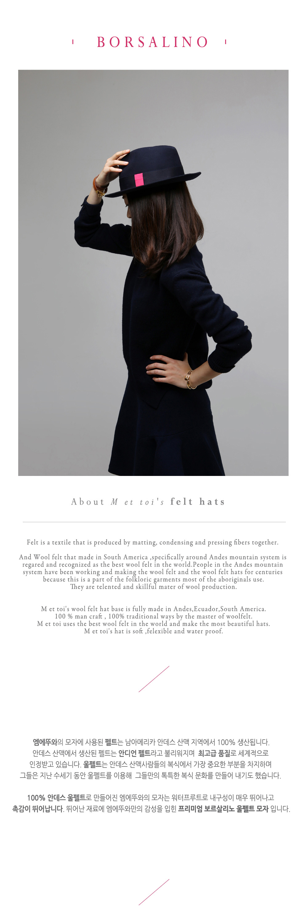 | 엠에뚜와의 모자에 사용된 펠트는 남아메리카 안데스 산맥 지역에서 100% 생산됩니다. 안데스 산맥에서 생산된 펠트는 안디언 펠트라고 불리워지며 최고급 품질로 세계적으로 인정받고있습니다. 울펠트는 안데스 산맥사람들의 복식에서 가장 중요한 부분을 차지하며 그들은 지난 수세기 동안 울펠트를 이용해 그들만의 톡특한 복식 문화를 만들어 내기도 했습니다. 100% 안데스 울펠트로 만들어진 엠에뚜와의 모자는 워터프루트로 내구성이 매우 뛰어나고 촉감이 뛰어납니다. 뛰어난 재료에 엠에뚜와만의 감성을 입힌 프리미엄 보르살리노 울펠트 모자 입니다. |