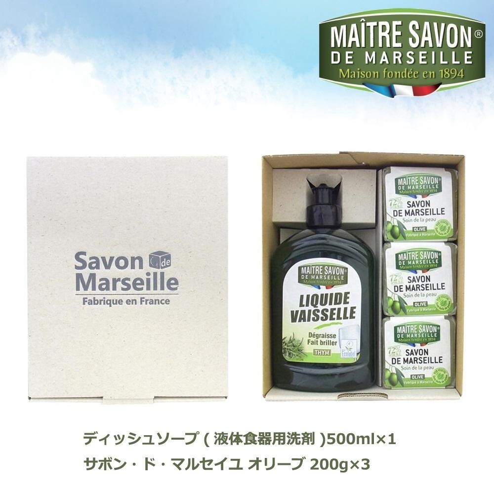 | セット内容 | ディッシュソープ(液体食器用洗剤)500ml×1 サボン・ド・マルセイユ オリーブ200g×3(商品区分:化粧品) |