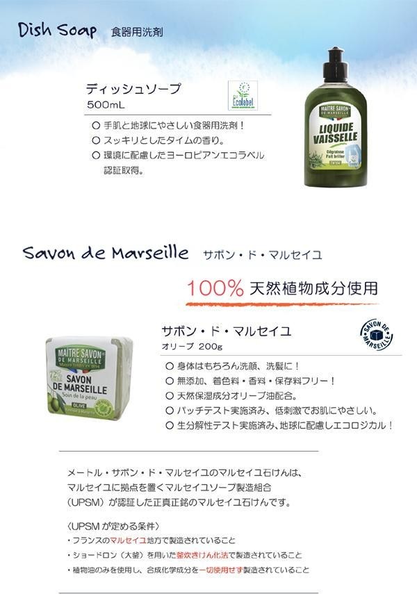 | 成分 | 【ディッシュソープ (液体食器用洗剤)500ml】 界面活性剤(17.5%、ラウレス硫酸Na、コカミドプロピルベタイン)、増粘剤(塩化ナトリウム)、湿潤剤(乳酸)、防腐剤(メチルイソチアゾリノン)、着色剤、香料 (液性:弱酸性) 【サボン・ド・マルセイユ オリーブ200g】 オリーブ脂肪酸Na・ヤシ脂肪酸Na・水・塩化Na・水酸化Na |