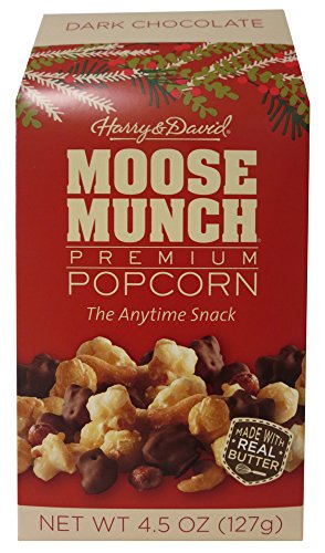 -. Binding : Misc. -. Brand : Moose Munch -. EAN : 0780994817975 -. Feature : Dark Chocolate Moose Munch is popcorn, almonds, and cashews covered in caramel and dark chocolate / Makes an exceptionally sweet and savory delight / Made in the USA / Each piece of popcorn is the perfect shape to hold the ultimate amount of rich, buttery caramel / A delicious seasonal snack or gift -. Label : Harry & David -. Manufacturer : Harry & David -. ProductGroup : Grocery -. ProductTypeName : GROCERY -. Publisher : Harry & David -. Studio : Harry & David -. Title : Moose Munch Dark Chocolate Holiday Caramel Popcorn -. UPC : 780994817975