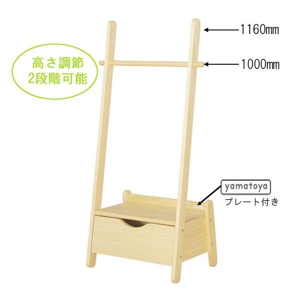 シンプルながら丸みをおびたデザインのハンガーラックは引き出し付きで、収納力もたっぷり。この一台で通園・通学グッズをすっきりひとまとめにすることができます。ハンガーパイプは2段階に高さ調節できます。 |