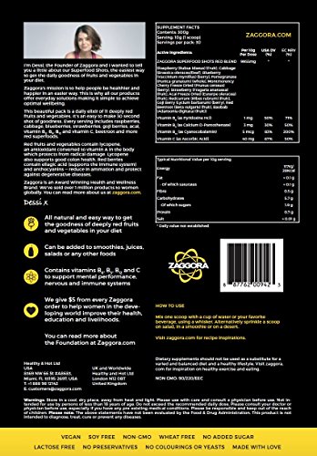 -. Feature : THE EASIEST WAY TO EAT YOUR REDS SUPERFOODS: mix of 11 deeply red superfoods. Can be added to salads, smoothies or just drank in a shot with water! / ALL IN ONE: Contains 11 amazing red superfoods - the only red supplement you need - raspberry, blueberry, pomegranate, montmorency Cherry Freeze Dried, strawberry, Acai Freeze Dried, Redcurrant, Goji Berry, Red Beetroot, Baobab. SP.R.Inkle on smoothies, salads or just with water! / RED SUPER POWERS: deeply red and purple fruits and vegetables contain an antioxidant group called anthocyanins, which are associated with reducing inflammation and memory preservation. / VITAMIN ENRICHED: added vitamins B6, B5, B12 and C. B Vitamins help to reduce tiredness while Vitamin C is a natural antioxidant, helping to support a healthy immune system and healthy body. / AWARD WINNING: by Zaggora, an award winning brand with 1ml products sold. Our Zaggora Giving program creates opportunity for women in the developing world.