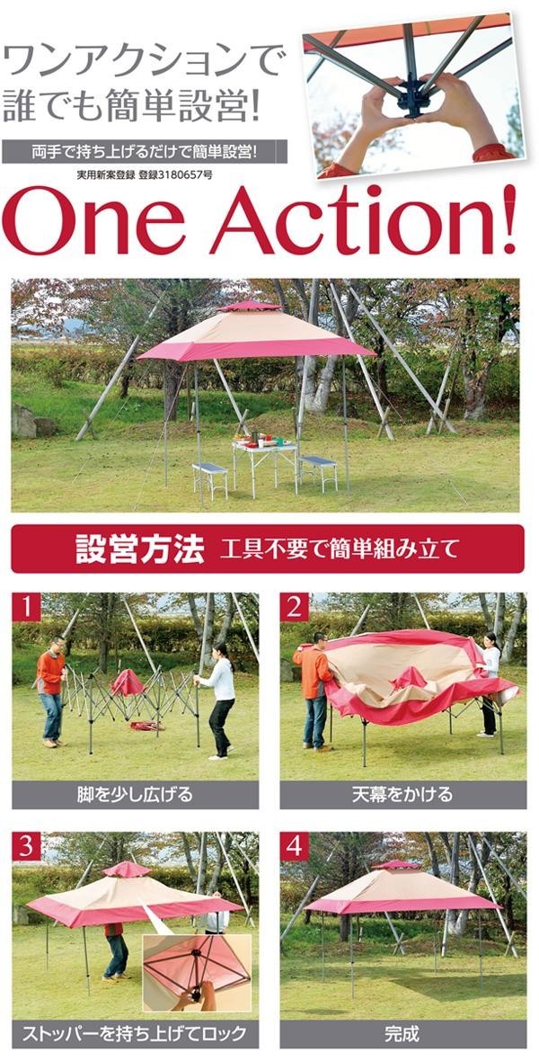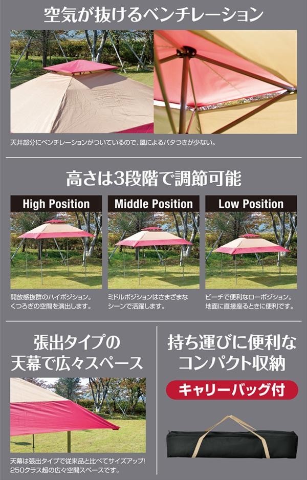 キャンプ、バーベキュー、運動会など、日陰が欲しい時や地面に直接座るときに便利なタープです。高さはシーンに合わせて3段階で調節ができます。折り畳めばコンパクトになるので持ち運びにも便利です。 |