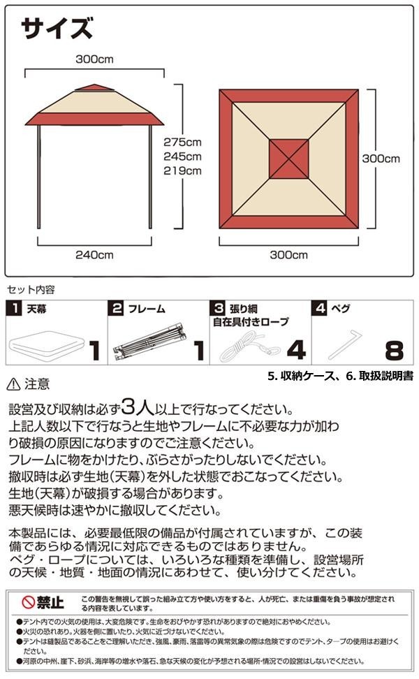| サイズ | 約300×300×275cm 個装サイズ:112×20×21cm |