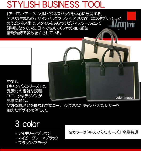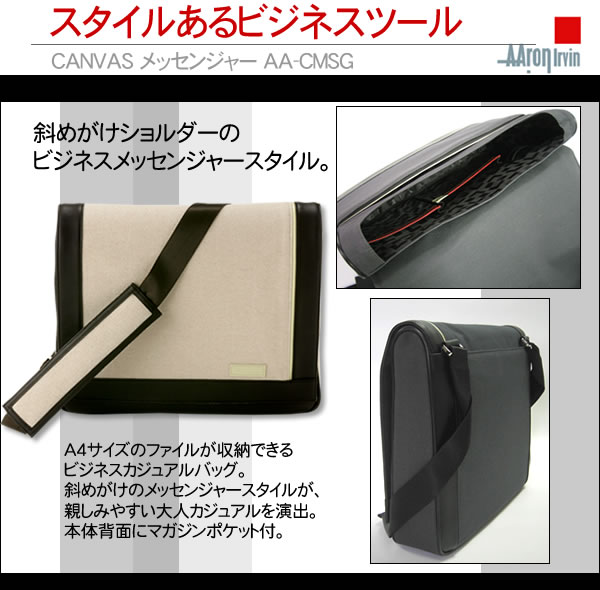 | キャンバス×レザーの異素材が見事に融合したアーロン・アーヴィンのキャンバスシリーズ。AA-CMSGはA4サイズのファイルが収納できるビジネスカジュアルバッグ。斜めがけのメッセンジャースタイルが、親しみやすい大人カジュアルを演出! |