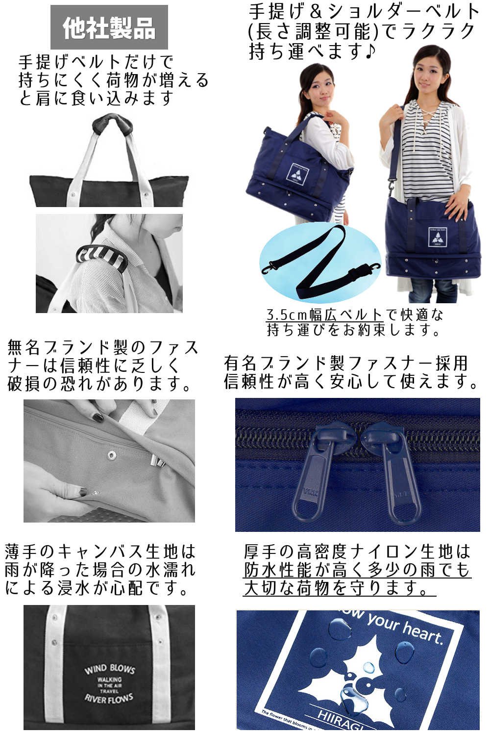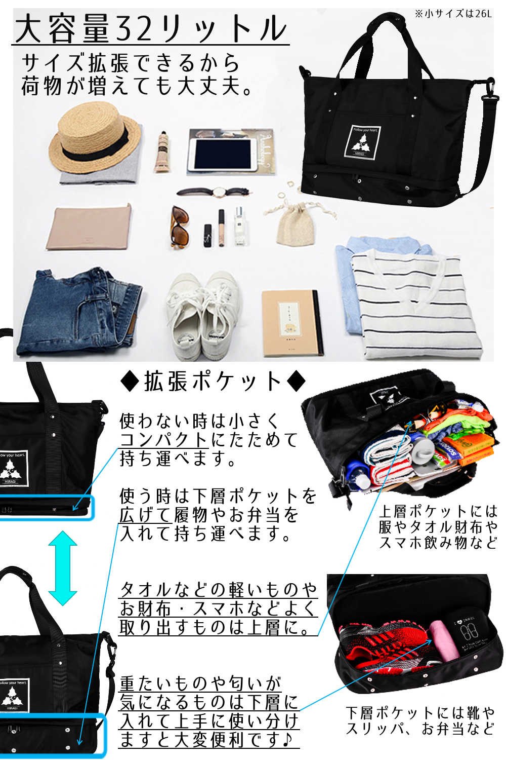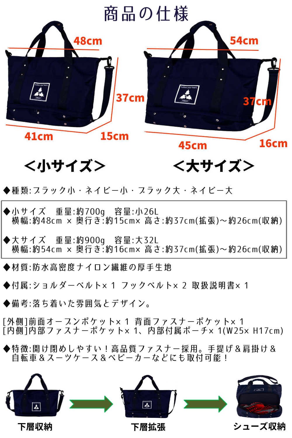 In upper pockets you can store commonly used items such as wallets and smartphones, light things such as towels, underwear pockets can be stored separately with heavy items such as shoes, folding umbrellas and lunch boxes.