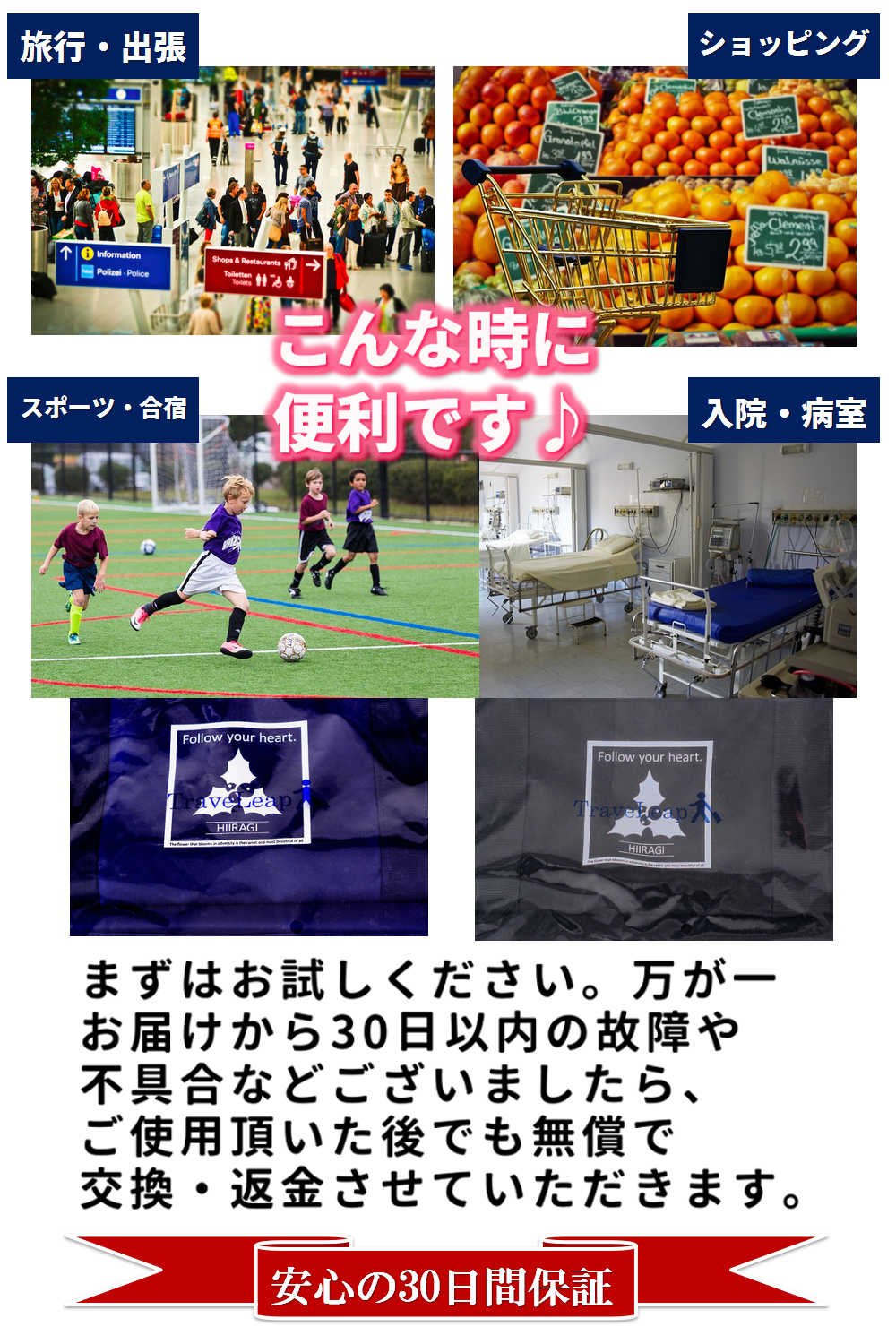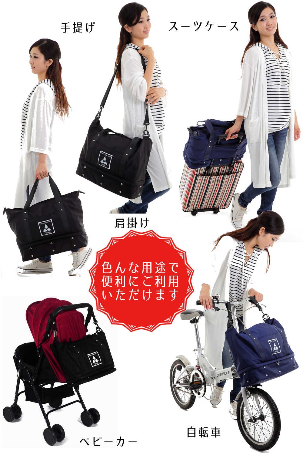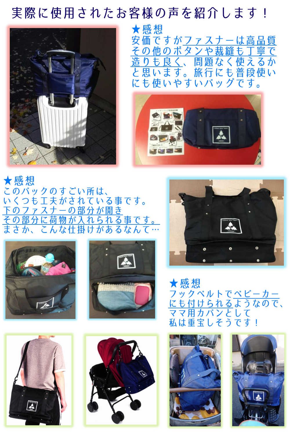 In upper pockets you can store commonly used items such as wallets and smartphones, light things such as towels, underwear pockets can be stored separately with heavy items such as shoes, folding umbrellas and lunch boxes.