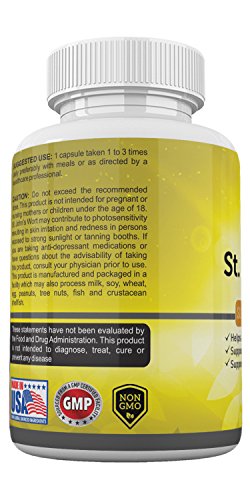 -. Feature : WHAT YOU NEED: Are you starting to show signs of emotional and mental vulnerability lately? Do you constantly feel overwhelmed by day to day problems and would like to have a calmer, more optimistic look on things? We have the solution! / HEALTH BENEFITS: The Saint John's Wort capsules have been used for decades as a natural remedy for treating different conditions, such as anxiety, depression or PMS syndromes. Additionally, it promotes a general soothing mental and emotional state, helping you relax and unwind. / 100% SATISFACTION GUARANTEED - We want you to be completely satisfied. If you are in any way dissatisfied we'll refund your money. No questions asked / ALL-NATURAL INGREDIENTS: This dietary supplement contains a special blend of herbs and specially selected plants. The 0.3% hypericin concentration and natural ingredients guaranteed to offer maximum results! / BE A BETTER SELF: With regular use of these capsules, you'll notice major improvements in your day to day social interactions, you'll have a better, more optimistic perspective and state of mind. They'll help you combat depression and anxiety symp in their incipient state. In addition, Saint John's Wort will also help you combat smoking withdrawal and can be useful for symp of menopause.