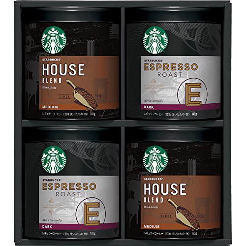 -. Feature : ス.タ.ー.バ.ッ.ク.ス レギュラーコーヒー ギフトセット / お中元、お歳暮期間限定のギフトセットです / ●ス.タ.ー.バ.ッ.ク.スコーヒーハウスブレンド160g×2・エスプレッソロースト140g×2 / ■スタバが好きなあの人の笑顔が浮かぶギフト。ス.タ.ー.バ.ッ.ク.スのお店で挽く豆と同じ、レギュラーコーヒーをギフト限定の缶に詰合せ。