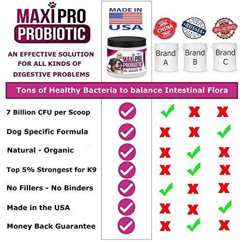 -. Feature : ULTIMATE PROBIOTICS SUPPORT YOUR DOGS SENSITIVE TUMMY! Maxi Pro formulation is designed to relieve your pup from yeast & urinary tract infections, gas, bloating, diarrhea, loose stool, & other discomforting digestive issues. Potent digestive enzymes support healthy bowel movements by stimulating the intestinal tract to excrete backed up feces, PAIN FREE. Our probiotic supplement aids ALL DOGS OF ANY SIZE. Help your pet feel relieved & rejuvenated. Support its overall digestive health. / INCREASE LONGEVITY OF YOUR PET SO IT MAY LIVE A LONG, HAPPY, & FULL LIFE. We understand a pet's life is fragile & short. We created Maxi Pro to guard your dog (& cat) from bad bacteria that weakens its immune system & makes it more acceptable to harmful bacteria. Probiotics microorganisms help balance gut health by removing toxins & excess bacteria. Removing unwanted chemicals, increases nutrient absorbency. Maxi Pro provides vital nutrients your pet needs to live a longer, happier life. / 5 BILLION COLONY FORMING UNITS TO TREAT SKIN IRRITATIONS. As pet owners, we understand the constant hassle of your pet shedding or scratching. Luckily, our pure probiotics blend provides nutrients needed to promote gut health & healthy, vibrant skin & coat. Stop itchy, dry, sensitive skin. Our probiotics powder supports your pups skin & coat protecting it from allergens that cause infection. Give your pet this powerful probiotic every day. Let them feel the relief of a healthy, moisturized coat. / SKIP THE HASSLE WITH TABLETS & CHOOSE OUR DELICIOUS PROBIOTIC POWDER. We understand that some pets need some 'convincing' with tablets or chewables. Skip the strle and switch to our once a day powder formula. No clean up required! All you have to do is sP.R.Inkle one scoop, measured to 1 gram, on your dog's or cat's food and watch them devour a healthy, nutritious meal that benefits them in more than one way. Our powered supplement is so good your pets will be convinced it's a treat. / PETS ARE LIKE FAMILY. GIVE YOUR FAMILY THE ULTIMATE PROBIOTICS SUPPLEMENT TO IMPROVE LONGEVITY AND HEALTH. All of our products are free of any harmful preservatives and additives. Our supplements are manufactured in the USA in an FDA registered facility and third partied tested for nutritional value and safety. We guarantee your fur baby will feel rejuvenated and relieved; or your money back! No questions asked. Try it now, RISK FREE!