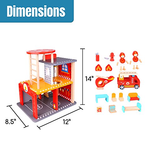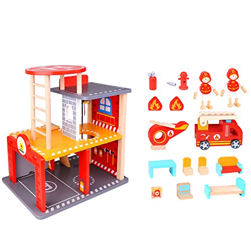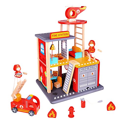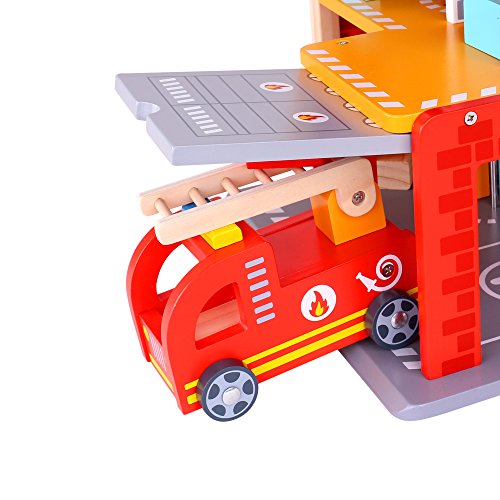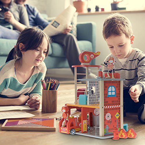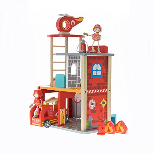 Realistic Design - This fun wooden toy play set is equipped with a working garage, ladder and expandable hose. This will give kids an inside look at the daily life of their everyday heroes.