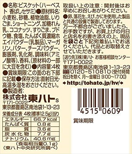 原材料:小麦粉、砂糖、植物油脂、いりごま、ショートニング、加糖れん乳、ココナッツ、すりごま、ブドウ糖、食塩、たんぱく質濃縮ホエイパウダー(乳製品)、マーガリン、バター、チーズパウダー、膨脹剤、乳化剤、調味料(アミノ酸等)、香料、(原材料の一部に大豆を含む)