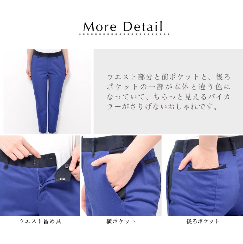 ウエスト部分と前ポケットと、後ろポケットの一部が本体と違う色になっていて、ちらっと見えるバイカラーがさりげないおしゃれです。