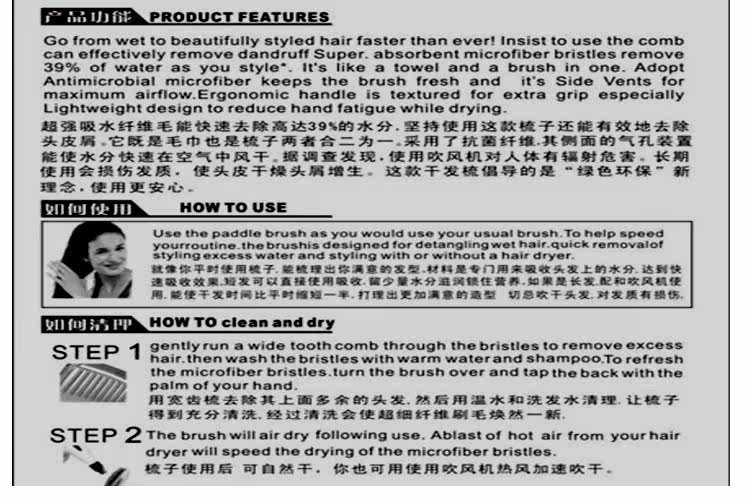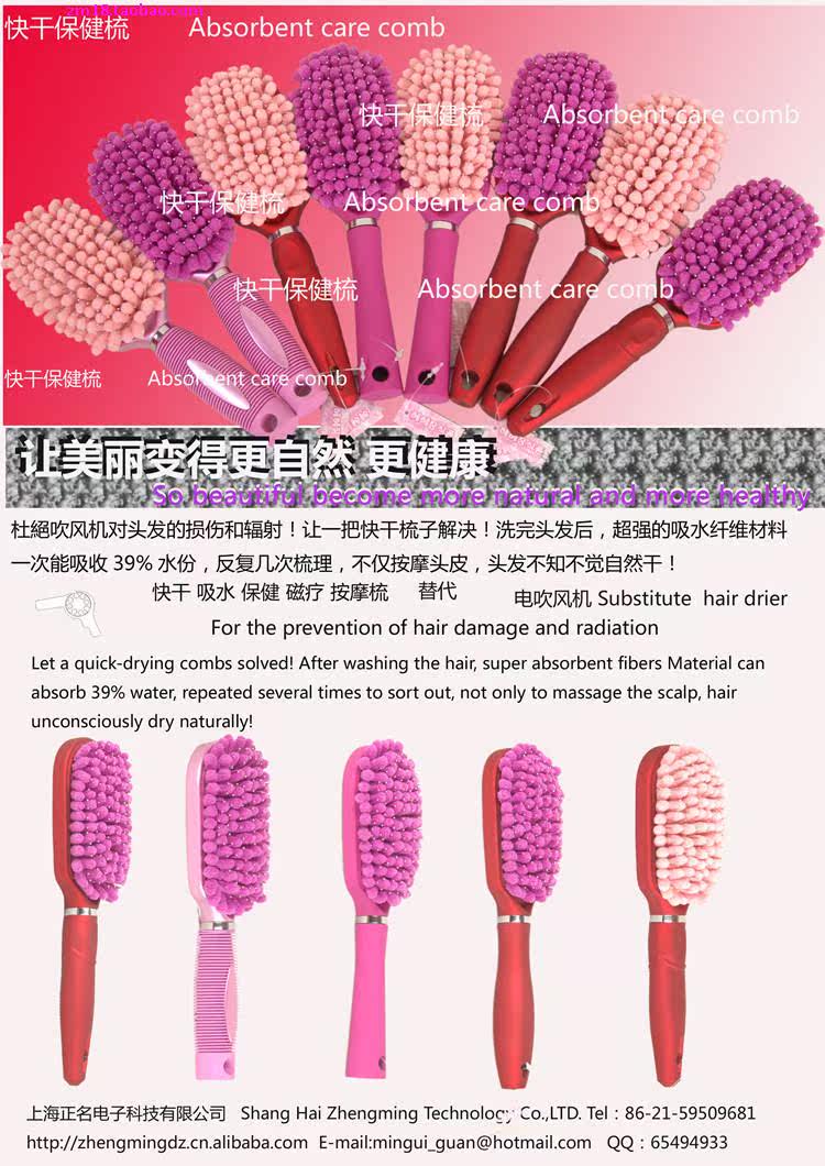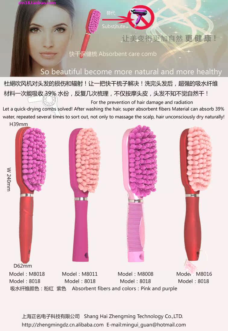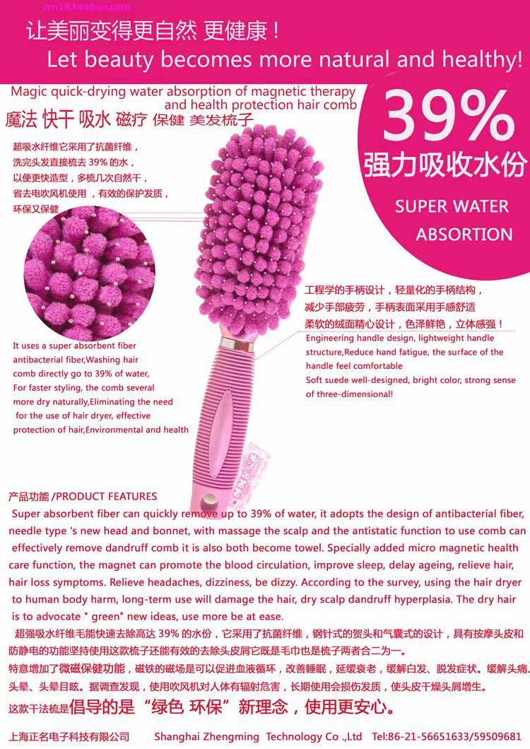 洗完头发直接梳去39%的水,以便更快造型,省去电吹风机使用 ,有效的保护发质,环保又保健。