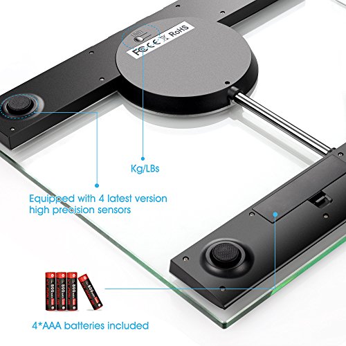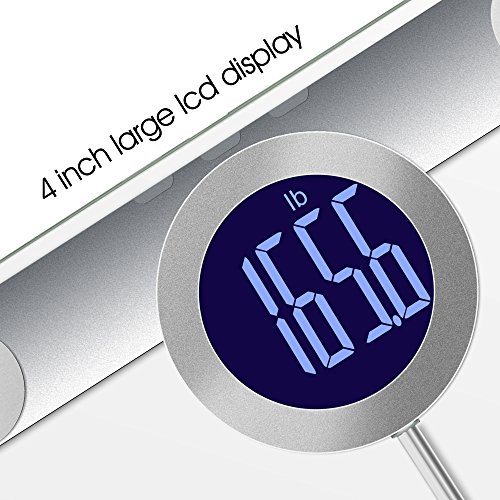 -. Feature : 19 Inch Large Oversize Sturdy Bathroom Scale, One of the Largest Heavy Duty digital bathroom scale on the Market. Extreme wide steady platform makes it easy and solid for those with large feet or balance issues / Equipped with 4 latest version High Precision Strain Gauge Sensor System which ensures consistent and accurate measurements / Unique large round LED backlit display makes this body weight scale looks modern, simple and exquisite, also very easy to read / Max weight capacity 440lb /200kg; graduation increments 0.2lb /0.1kg; lb/kg can be swiched through the Unit button at the back side of the scale / Immediate reading as soon as you step on the bathroom scale. Auto-calibrated and automatically turns off allows longer battery life; runs on 4xAAA batteries (batteries included)
