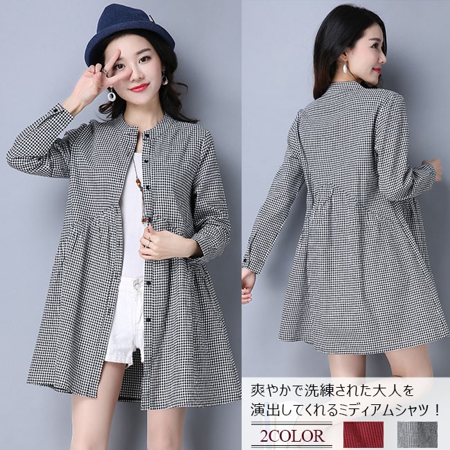 | 商品名 | シャツワンピース ミディアムシャツ チェック柄シャツ レディース 前開き ブラウス トップス ラウンドネック 薄手 2017秋冬新作 |
