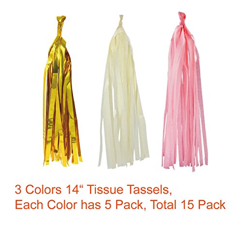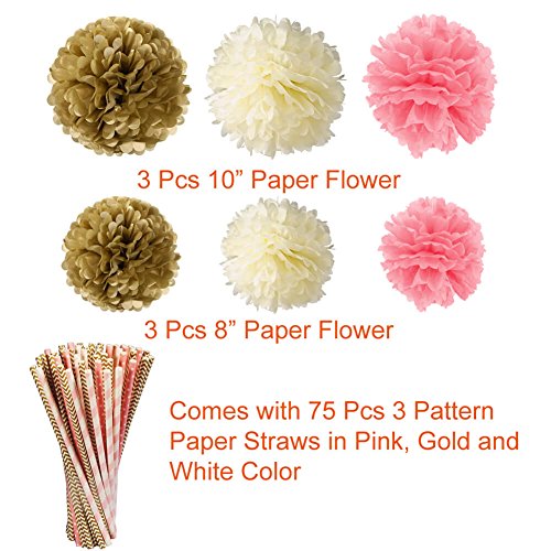Product Details: Tissue paper flowers: Size: 8"/ 10" Color: gold, pink and cream Material: premium quality tissue paper Quantity: 6 pieces Paper Tassels: Size: 14" in length Color: cream, gold and pink, each color comes with 5 pcs Material: premium quality tissue paper Quantity: 15 pieces Gold Foil Fringe Curtain: - Measures 3 feet x 10 feet Paper Decoration Straws: Size: 0.24" in diameter Length: approximately 7.75" Color and pattern: 25 pcs pink stripe, 25 pcs pink dot, 25 pcs gold wave Material: FDA approved paper material and food grade ink, non-toxic and odor-free Quantity: 75 pieces