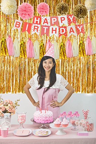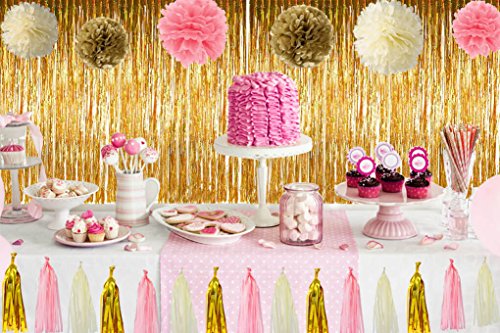 Package Includes: 1 * Gold foil fringe curtain 6 * Tissue paper pom poms 15 * Paper tassels 75 * Paper drinking straws