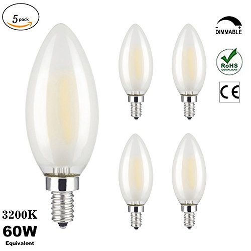 (5 Pack) ZYYRSS 6-Watt LED Filament Candelabra Bulb Dimmable, 3200K Soft White ,600 Lumens, E12 Candelabra Base ,60W Incandescent Equivalent, Frosted Glass C35 Torpedo Shape Bullet Top