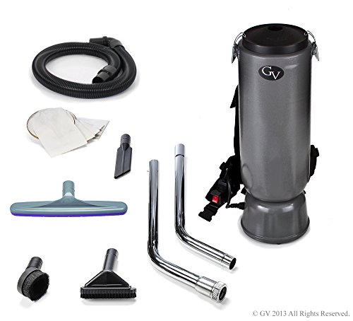 BRAND NEW FACTORY SEALED GV 10 Quart HEPA Backpack Vacuum. We have sold over 30,000 vacuum cleaners and know vacuums and this is the vacuum that we use to clean our 13,000 square foot warehouse. It quickly cleans any surface including low pile and high pile carpet. We prefer it because its the most powerful backpack and its so much faster. Aluminum construction makes it lightweight and super easy to use. Only Weighs 11 lbs! If you have lots of hard floor surfaces or furniture in your home or business then this vacuum will save you time. Has super comfortable adjustable padded shoulder and waist straps for easy comfortable cleaning. On/Off switch is attached on the belt for easy on/off, and tools can be stored on the belt as well. LOADED with Easy to use tools! Premium tools include: Crevice tool, duster brush, upholstery tool (with slide off brush), and deluxe floor tool. The floor tool is the high end which pivots so that you can vacuum side to side or in a half circle as you walk. Also comes with 6 10 quart bags! Mini Head with Brushroll - This vacuum has so much power that it easily powers the brushroll head. These mini head attachments are super popular. They can be used to vacuum throw rugs, upholstery couches or cars, stairs and work really good for pet hair. 3 stage Filtration & HEPA bags - Include 6 HEPA bags, sealed HEAP filter and 10 Quart SMS washable cloth bag. Up to 120 inches of water lift for POWERFUL deep cleaning! The GV backpack commercial vacuum is designed to be one of the most powerful vacuums made. Industries best 2 Fan Double Ball Bearing Ametek-Lamb Motor. 2 Year Motor Manufacturer Warranty.Feature