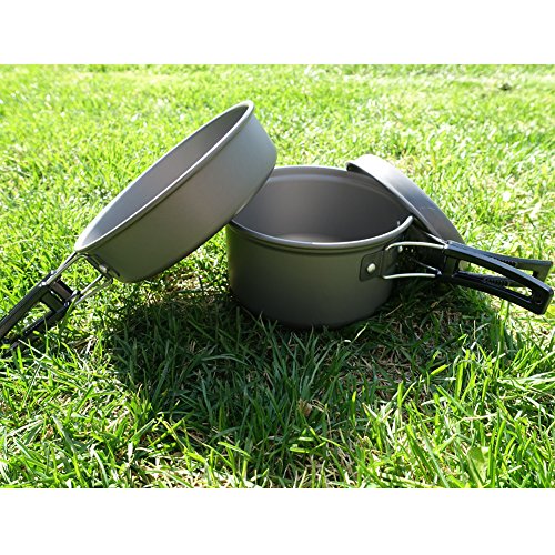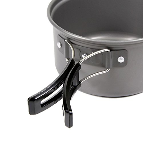 Small size and portable: All the objects in this cooking set can be stored together in a mesh bag for convenient carry.Foldable handles on pot, frying pan and soup spoon. They can be folded to save space.